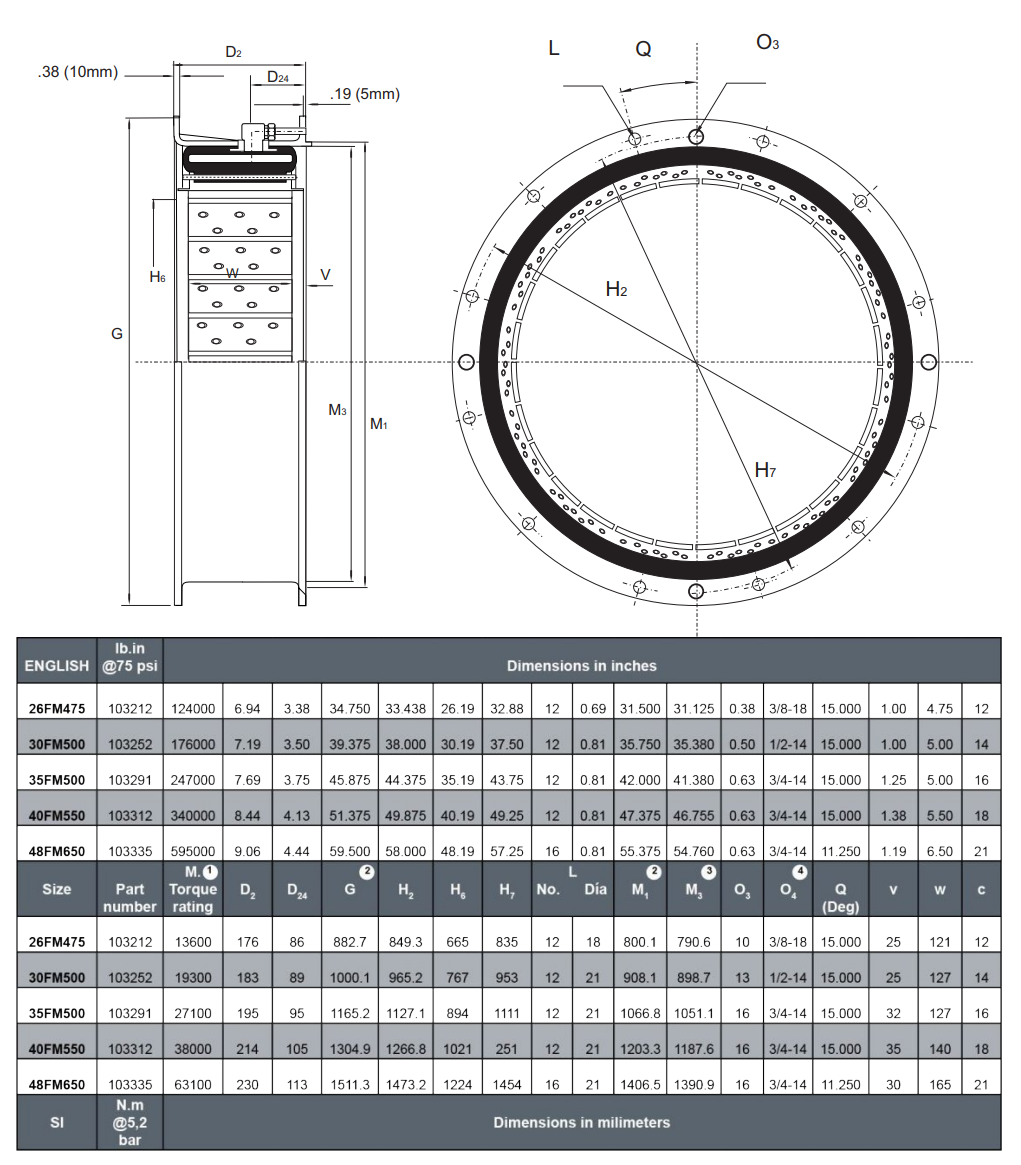 件传递扭矩的能力取决于施加的气压和转速。FM元件的橡胶管结构允许它在比FK元件更高的工作压力下工作,最大建议压力为150 psi (10.3 bar)。